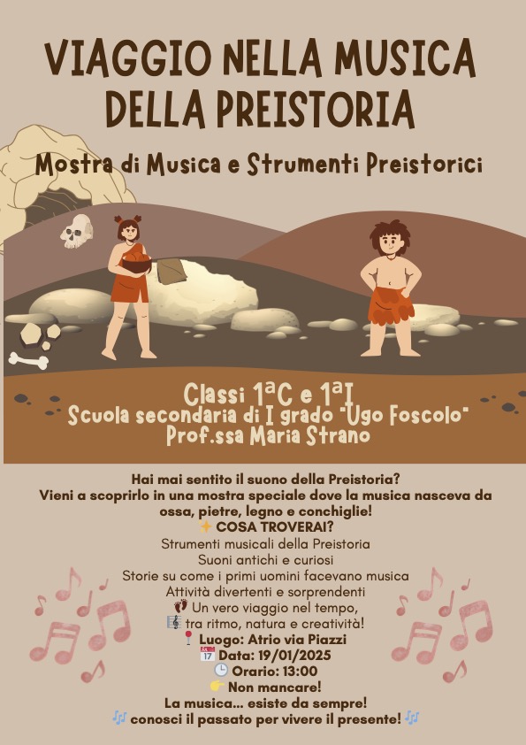 È stata inaugurata presso l’atrio di via Piazzi la mostra “Viaggio nella musica della Preistoria”, realizzata dalle classi 1ªC e 1ªI della scuola secondaria di I grado “Ugo Foscolo”, sotto la guida della prof.ssa Maria Strano.